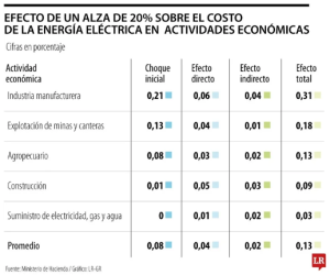 “Como resultado del ejercicio de simulación, se evidencia que un aumento sobre el precio de la energía en 20%, derivado de la eliminación de la exoneración de contribución de solidaridad, generaría un incremento promedio en los costos de producción de los seis sectores analizados en un 0,13%. (…) En particular, dentro de los sectores analizados, la actividad de industrias manufactureras sería la que enfrentaría el mayor incremento en los costos (+0,31%), los cuales se podrían traducir a un aumento en el precio de los bienes producidos”, reseña el borrador.