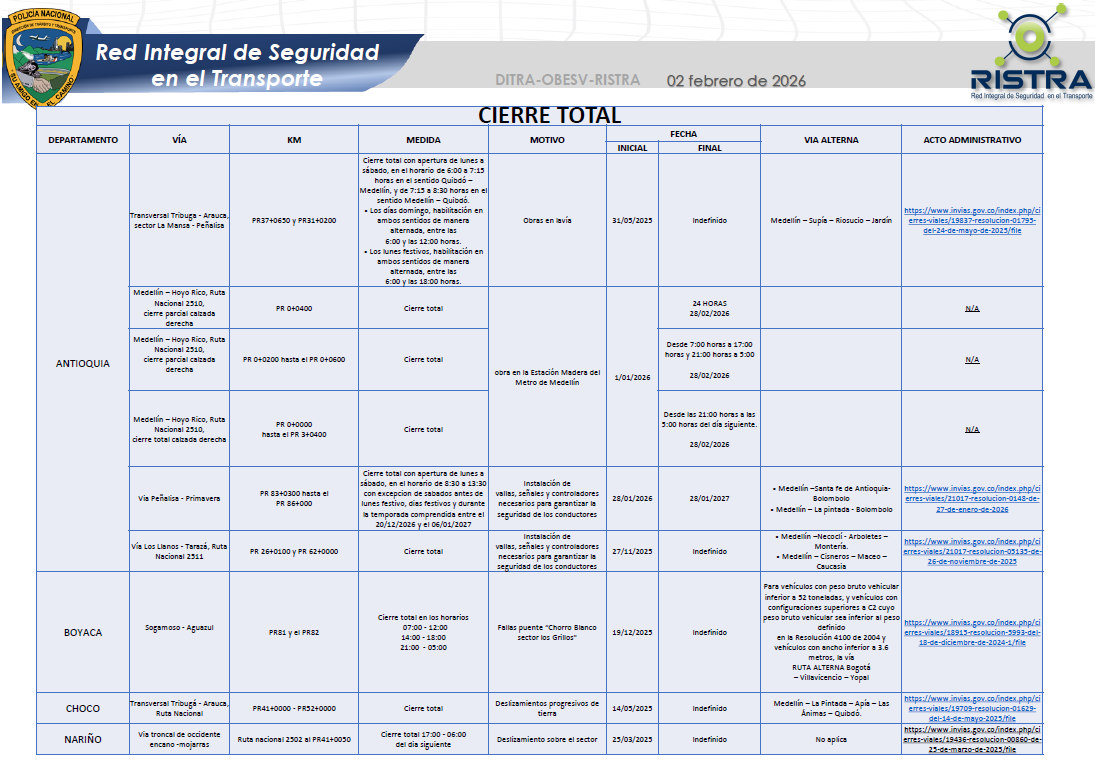 Estado de vías 02 de febrero de 2026
