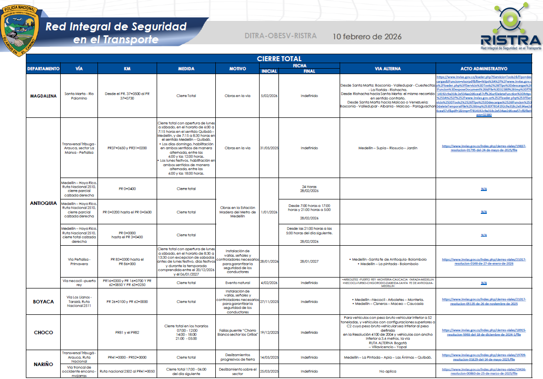 Estado de vías 10 de febrero de 2026