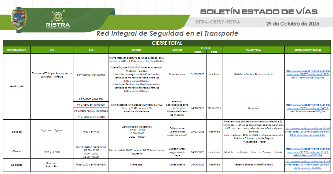 Estado de vías 29 de octubre de 2025