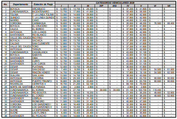 A la fecha, el Invías tiene a su cargo 38 estaciones de peaje, distribuidas en 16 departamentos, quedando definidas las tarifas de acuerdo con la clasificación vehicular de la siguiente manera: